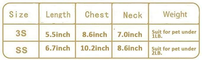 material: fleece storlekstabell: 3xs tillbaka 5,5-tums bröst 8,6-tums hals 7-tums kostym för husdjur under 1lbs2xs tillbaka 6,7 tum bröst 10,2 tum hals 8,6 tum kostym för husdjur under 2 kg